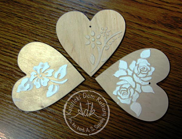 Na serduszkach z surowego drewna zakwitły kwiaty z past strukturalnych, "zasadzone" przez szablon.